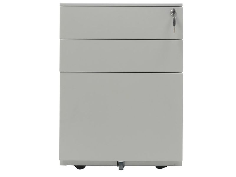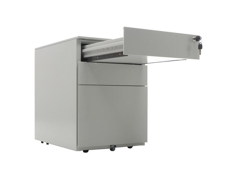 • Опции: пластиковые лотки и металлический ящик для канцелярских принадлежностей и других предметов. Возможность комбинирования цветов: корпус + фасады ящиков и крышка (конструкция тумбы металл+металл). Или отделка фасадов ящиков и крыши тумбы ламинированной плитой ЛДСП