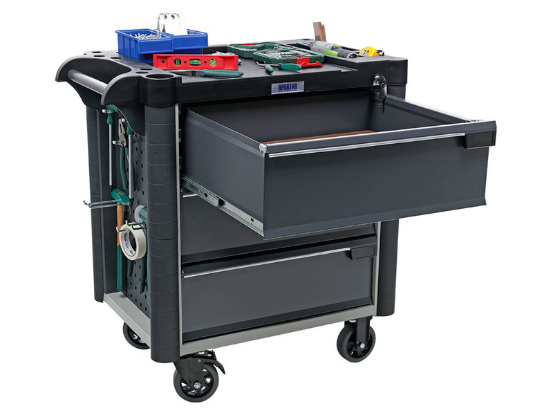 - Топ (пластик черного цвета) оснащён ложементами под инструменты для организации, хранения и удобства использования во время выполнения работ. Нагрузка на ТОП – 30 кг